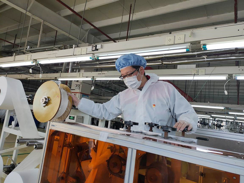 尚慶軍,紅豆黨員突擊隊的一位“拼命三郎”。已有9年黨齡的尚慶軍,不僅要做好疫情防控的“守門人”,檢測和登記每一位進出人員的體溫,同時早中晚三次還要對工廠的各個角落進行消毒,確??谡稚a線改造順利進行?!皬?月2號開始上班,已經連續(xù)20多天沒有陪伴家人?!鄙袘c軍說,“看著原材料從入口進去,一只只潔白的口罩從出口自動下線,我就感覺特別激動,特想哭?!?/span>