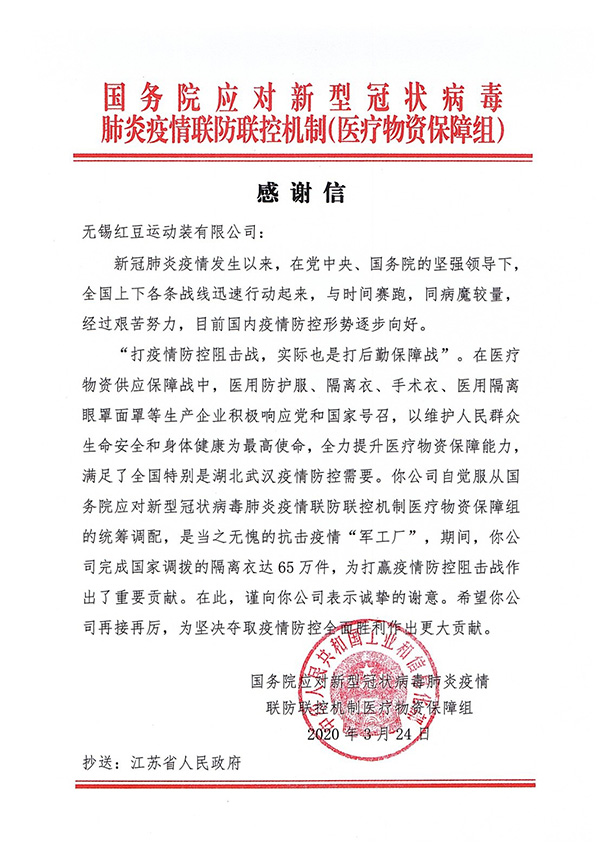 這是3月24日,紅豆集團(tuán)下屬的紅豆運(yùn)動(dòng)裝公司收到國務(wù)院應(yīng)對(duì)新型冠狀病毒肺炎疫情聯(lián)防聯(lián)控機(jī)制醫(yī)療物資保障組的感謝信中的一段話。